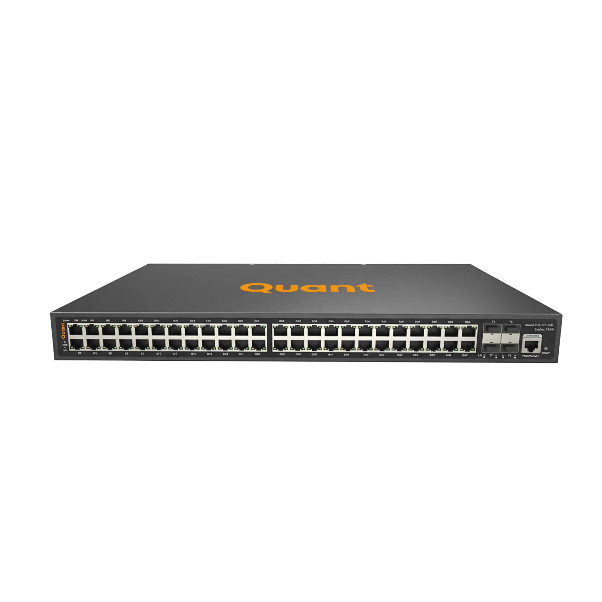 The Quant PoE Switch Series 3800 is a high-performance Layer 3 managed Gigabit PoE+ switch family featuring 10G SFP+ uplinks, designed for high-density IP surveillance, enterprise networking, and campus backbone applications. The series includes 24-port L3 and 48-port L3 models, both equipped with 4 × 1/10G SFP+ uplink ports, ensuring non-blocking wire-speed forwarding and seamless integration with fiber backbones. Supporting IEEE 802.3af/at PoE+, each RJ45 downlink port provides up to 30 W with a total PoE budget of 400 W (24-port) and 600 W (48-port). Advanced routing, VLAN, multicast, and QoS capabilities combined with rapid failover (ERPS <20 ms) make these switches ideal for large-scale, resilient networks.