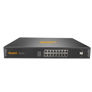 The Quant 7300 managed industrial PoE switch series is a Gigabit managed industrial PoE switch with 8×100/1000Base-X SFP fiber ports and 8×10/100/1000Base-T RJ45 ports, supporting IEEE 802.3af/at PoE up to 30W per port. It powers devices like wireless APs, IP cameras, and VoIP phones through network cables, ideal for industrial, transportation, and energy applications. It features L2+ management, IPv4/IPv6, ACL/QoS, VLAN, and supports STP/RSTP/MSTP (<50ms) and ERPS (<20ms) for reliable network redundancy. Configuration and PoE management are available via Web, CLI, SNMP, or Telnet, ensuring flexible, secure, and stable communication in demanding environments.