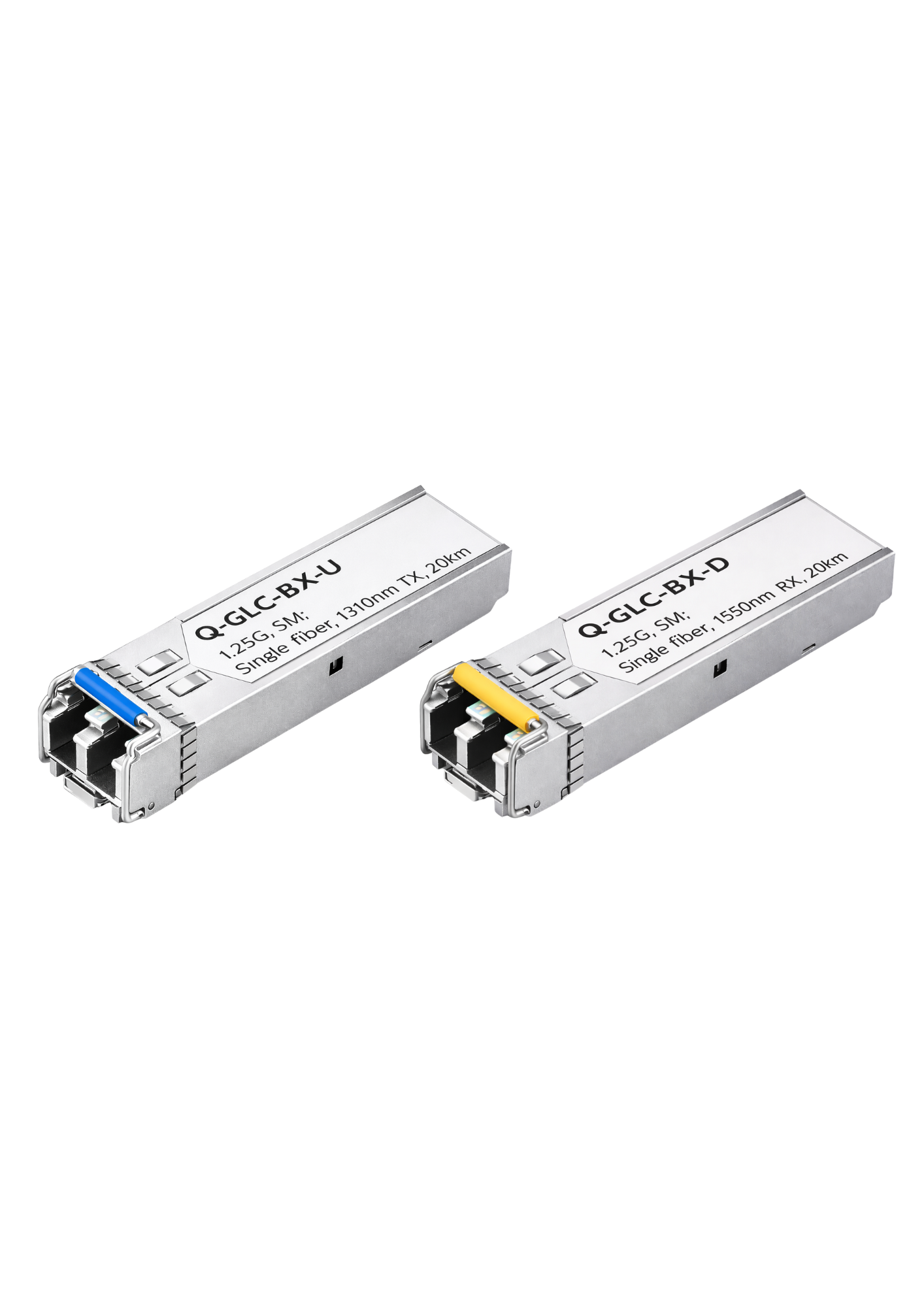 The Q-GLC-BX-U and Q-GLC-BX-D are hot-pluggable SFP bi-directional optical transceivers designed for Gigabit Ethernet and Fiber Channel applications over single-mode fiber. These modules enable single-fiber communication by transmitting and receiving signals at different wavelengths. The BX-U module transmits at 1310 nm and receives at 1550 nm, while the BX-D module transmits at 1550 nm and receives at 1310 nm. When used as a pair, they support transmission distances up to 20 km over single-mode fiber.