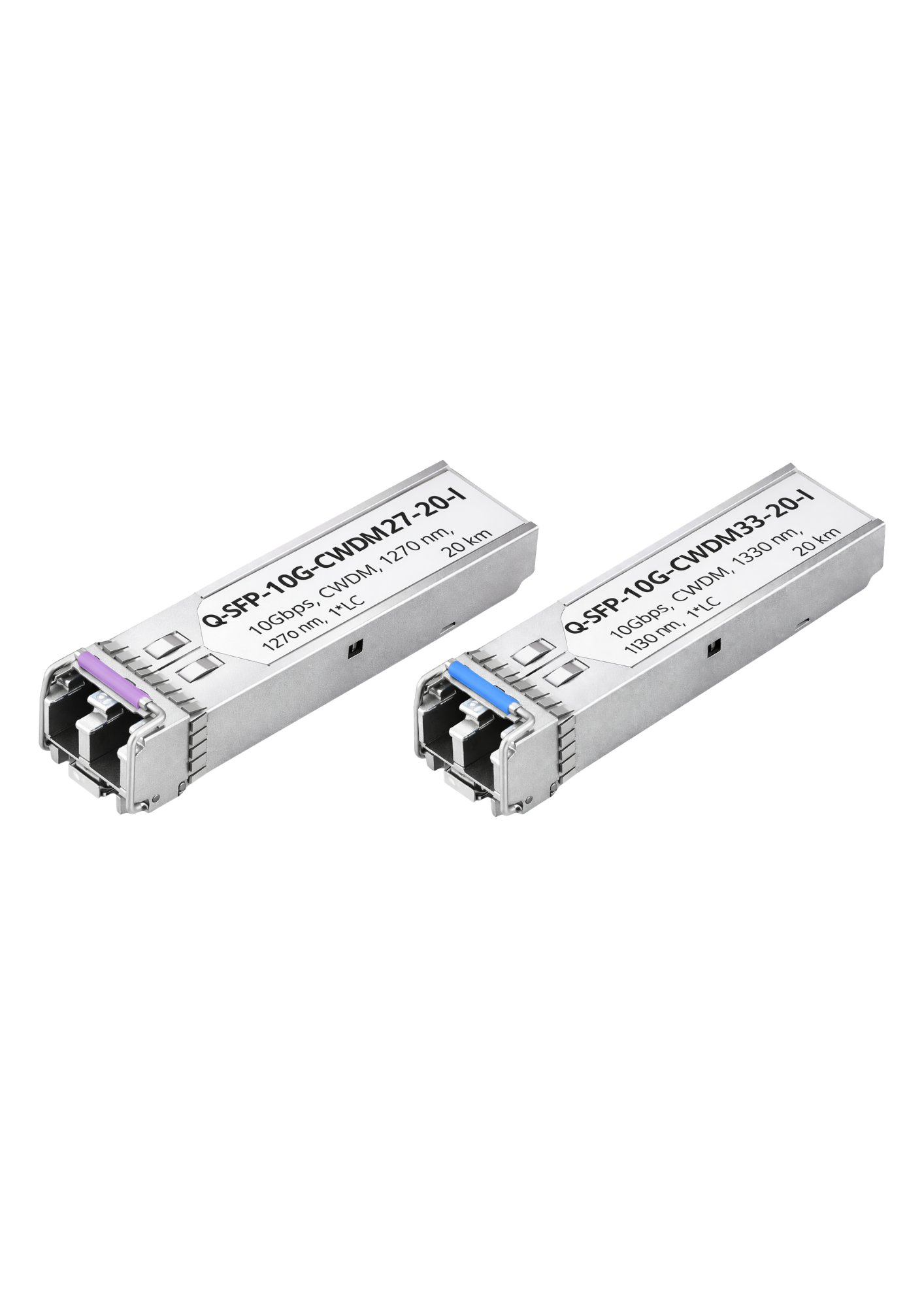 The Q-SFP-10G-CWDM27-20-I and Q-SFP-10G-CWDM33-20-I are hot-pluggable SFP+ optical transceivers designed for 10 Gigabit Ethernet transmission over single-mode fiber. These modules utilize CWDM DFB laser technology and operate at 1270 nm and 1330 nm wavelengths, supporting transmission distances up to 20 km. They comply with IEEE 802.3ae 10GBASE-LR and SFF-8431 standards and include Digital Diagnostic Monitoring (DDM) for real-time monitoring of transceiver parameters. The modules are designed for industrial environments with operating temperatures from -40°C to +85°C.